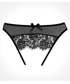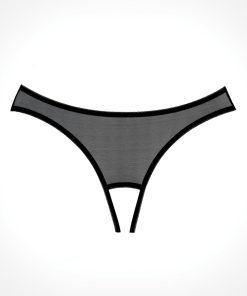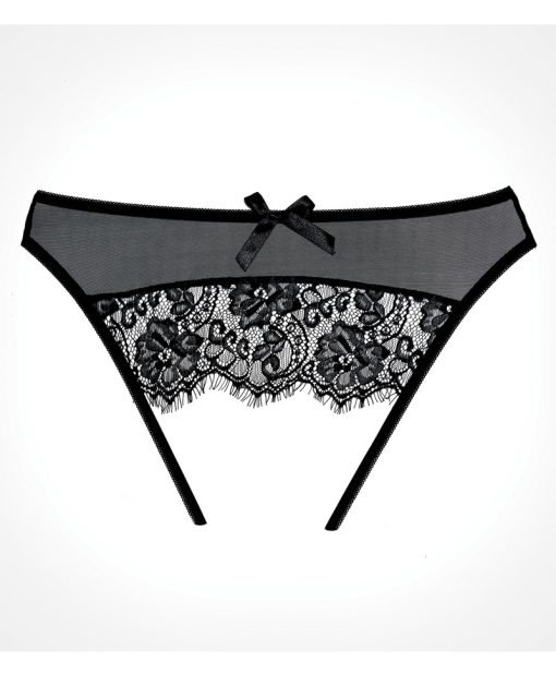 Fulfill his darkest desires in this sexy panty featuring a low cut waist, a sheer mesh front, a bikini style with an eyelash lace back panel, a striking satin bow accent, and an open rear with booty shaping straps. Leave nothing to the imagination.
