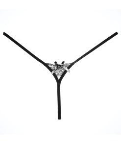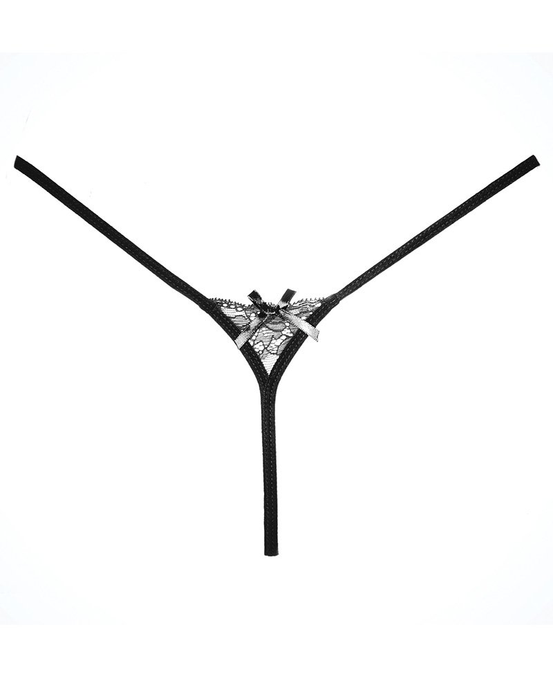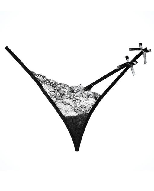This flirty black panty features a sheer, asymmetrical lace front panel with a scalloped trim, strappy detailing, satin bow accents, a thin waist band, and a thong cut back.
