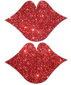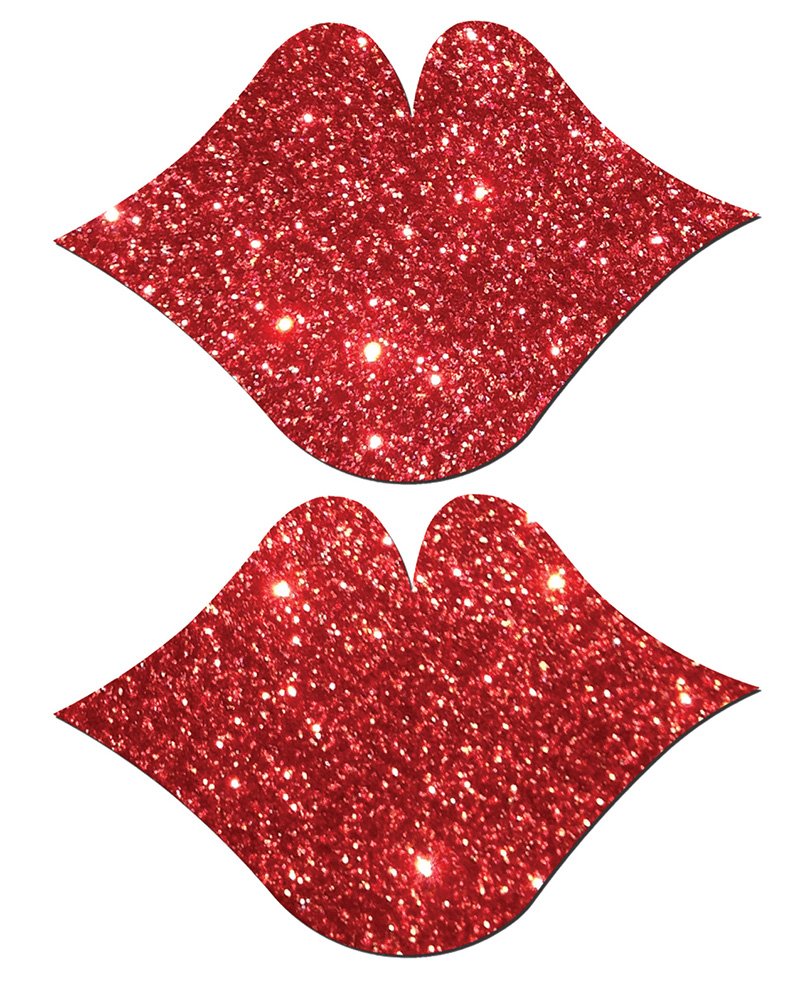 Bright Red Glittering Kiss Nipple Pasties by Pastease are hand made in the USA of durable, no mess, glitter pleather material that forms to curves and resists wrinkling over hardening nipples. Just peel and stick on clean, dry skin! All Pastease feature latex free, medical grade, waterproof adhesive that stay securely in place for as long as you like and until they are gently removed. Lip Pasties are Hip Pastease! Dimensions: 3 inches by 2.1 inches. Coverage Diameter: 1.7 inches.