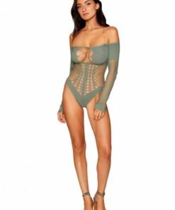 Long Sleeve Teddy Sage Green One Size from Dreamgirl Lingerie. Experience the allure of the Seamless Long Sleeve Teddy, blending intricate opaque and fishnet detailing alongside a captivating novelty pattern bodice, designed to mesmerize and flatter. Enhancing its elegance, this Teddy boasts a removable gold halter chain, offering versatility in styling options and adding a touch of sophisticated glamour to your look. The seamless construction ensures a sleek and comfortable fit, ideal for all day wear or intimate moments. The combination of long sleeves and novelty bodice pattern offers a unique and stylish aesthetic, perfect for making a bold statement in your lingerie collection. One size fits most. Ladies sizes. Sizes 2 to 14. Cups B/C. Bust 32 inches to 38 inches. Waist 24 inches to 32 inches. Hips 34 inches to 40 inches. Weights 90 pounds to 160 pounds.
