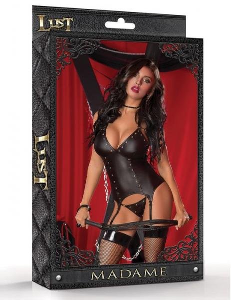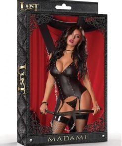 Halter bustier and g-string panty with silver metal studs and rings, and premium leather look. Accessories not included. Ladies sizes small to medium, S/M.