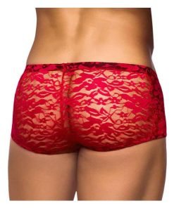 Mini Shorts Stretch Lace Small Red from Male Power Underwear. Our Stretch Lace Mini Shorts obscures the line of typical gender norms. The classic trunks cut flatters your physique while the soft and stretchy floral lace embellishes your assets. The comfort fit pouch adds to the sensation of luxury. Make room in your drawer, this short will become an everlasting favorite.