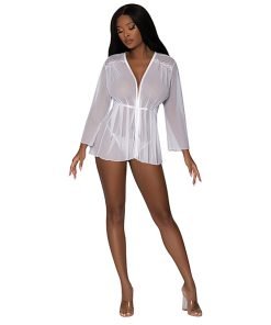 From the Exposed by Magic Silk collection, this style includes: a thigh length robe featuring breathable mesh, lace across the shoulders, flowy bell style full-length side slit sleeves, a ruched accent in the back, and an attached silky ribbon tie waist.