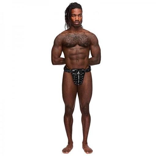 From the Leather collection by Male Power, this style includes: a thong featuring a padded comfort waistband, cage pouch, 1-inch adjustable buckle T-back, decorative back ring and a chastity lock and key.