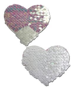 Pearl & White Color Changing Sequin Heart Nipple Pasties by Pasteaseà ® are hand-made in the USA of reversible sequin material that forms to curves and resists wrinkling over hardening nipples.
