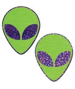 Neon Green/Glow in the Dark with Glittering Purple Eyes Nipple Pasties by Pastease® are hand-made in the USA of soft glittery material that forms to curves and resists wrinkling over hardening nipples. Just peel-and-stick on clean, dry skin. All Pastease® feature latex-free, medical-grade, waterproof adhesive that stay securely in place for as long as you like and until they are gently removed. Conceal or Reveal with Pastease® nipple pasties when worn with a sexy outfit, daring bikini, sheer top, revealing dress, Hefty bag, body lotion, crazy costume, party theme or nothing at all! Fear not humans….She comes in peace à  à  à  Dimensions: 2.4 inches X 3.1 inches. Coverage Diameter: 2.4 inches. *Charge under direct light for 15-30 minutes for maximum glow in the dark awesomeness!