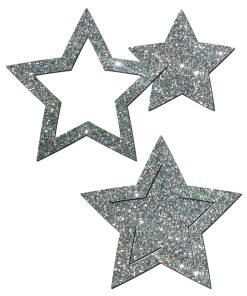Peek a Boob Glitter Star frame and center nipple pasties. Made in the USA of durable, no-mess glitter pleather material that forms to curves and resists wrinkling over hardening nipples. Just peel and stick on clean, dry skin! All Pastease feature latex free, medical grade, waterproof adhesive that stay securely in place for as long as you like and until they are gently removed. Dimensions 3 inches by 3 inches. Center 2 inches by 2 inches. Color Silver.