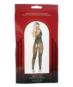 Lure in your lover with this sexy plus size bodystocking featuring a scoop neckline, sheer fishnet cups, rhinestone-studded accents, fitted long sleeves, an open crotch panel, a scoop back, and an over the toe style. (Thong not included.)