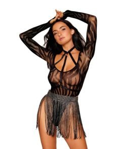 Swirl Knit Teddy and Harness Set Black One Size from Dreamgirl Lingerie. Immerse yourself in the allure of the Seamless Swirl Knit Pattern Teddy and Elastic Harness Set, a blend of comfort and allure in one ensemble. The low scoop neck Teddy features Long Sleeves with Thumb Holes, offering a sleek and contemporary style, completed with a flattering Thong back design. Complementing the Teddy, the separate Elastic Harness showcases intricate ring details and hook and eye back closures, adding a touch of sensuality and style to the ensemble.Adding to its versatility, this set is reversible, allowing you to wear the scoop neckline either in the front or in the back, offering diverse styling options to suit your mood and preference. One size fits most. Ladies sizes. Sizes 2 to 14. Cups B/C. Bust 32 inches to 38 inches. Waist 24 inches to 32 inches. Hips 34 inches to 40 inches. Weights 90 pounds to 160 pounds.