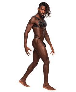 From the Leather collection by Male Power, this style includes a stretchy zippered criss cross chest harness with adjustable snap shoulder and chest straps, metal snaps, rings and zippers.